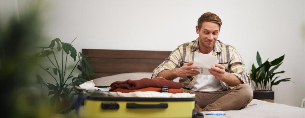 Lade Offline-Sessions vor Abflug, stell Benachrichtigungen sparsam ein, nutze Timer statt Endlos-Feeds. Teile deine liebsten Übungen, damit andere Leserinnen neue Favoriten entdecken können.